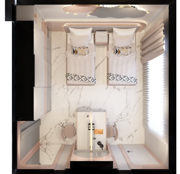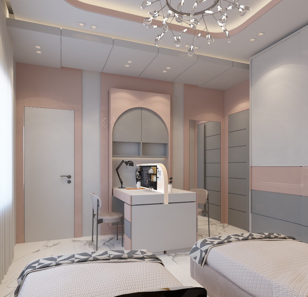 تصميم يناسب طلب العميل و وظيفة الفراغ حيث تم الحرص على تأمين فراغ الدراسة بالإضافة للسريرين و الخزانة.