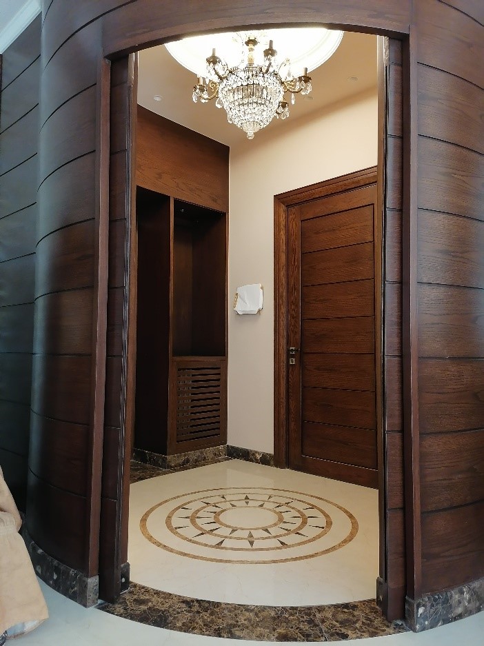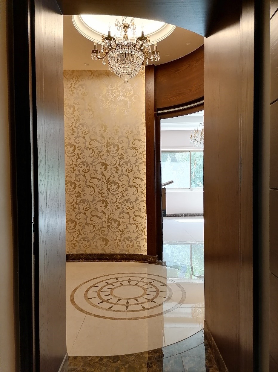 تم اعتماد الشكل المنحني (نصف دائرة) في التصميم لتأمين إمكانية الدخول إلى المنطقة المطلوبة في الصالون.