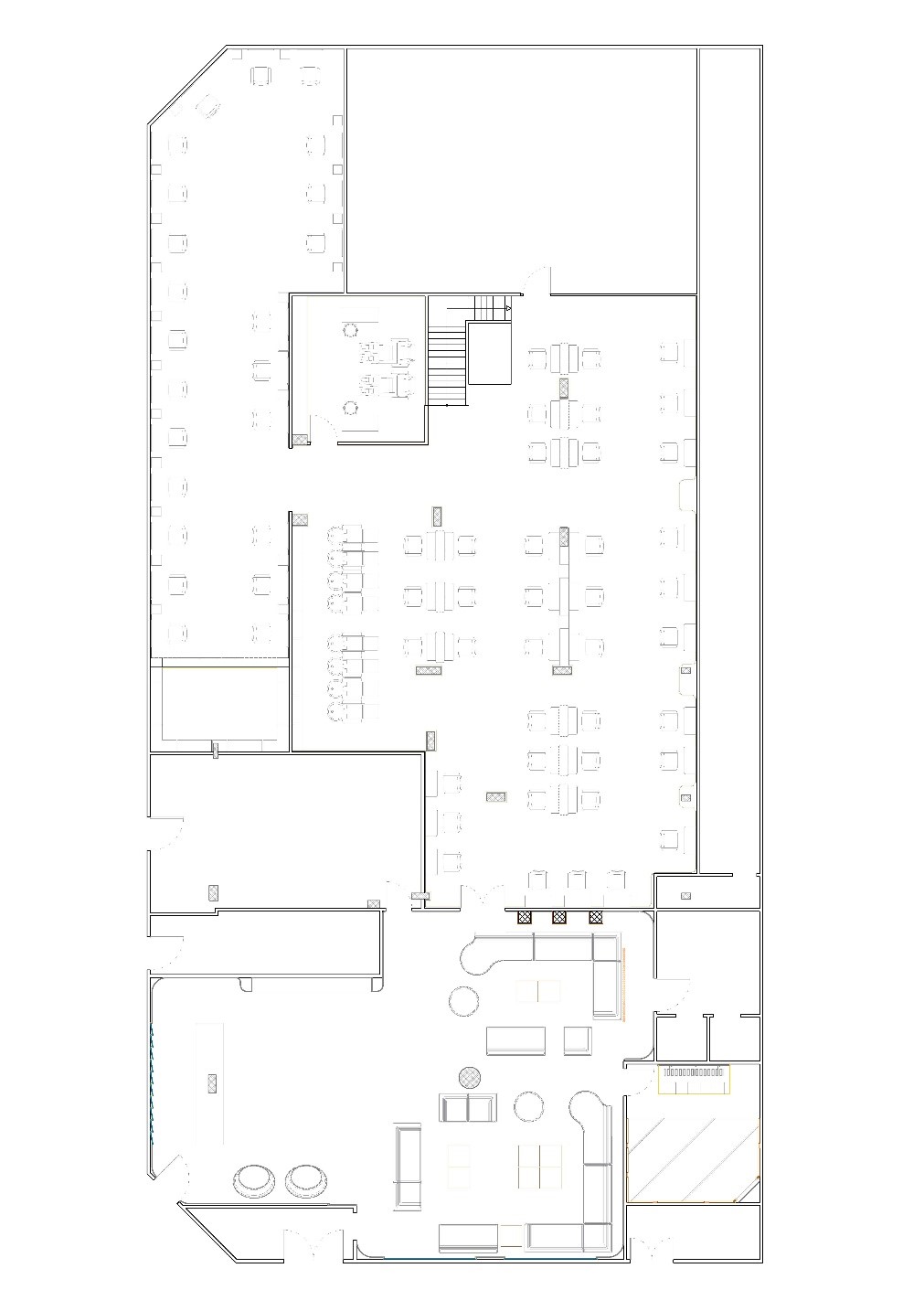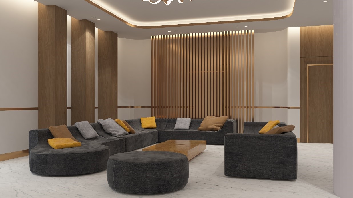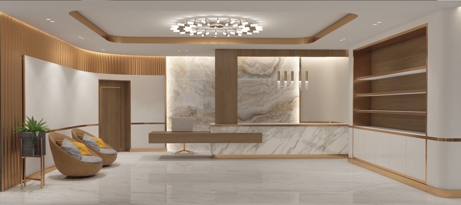 - توزيع الفراغ إلى منطقتين: منطقة جلسات للاستراحة و الانتظار و منطقة استقبال و تنسيق مواعيد و محاسبة.