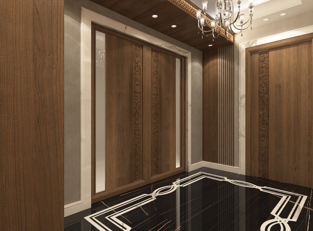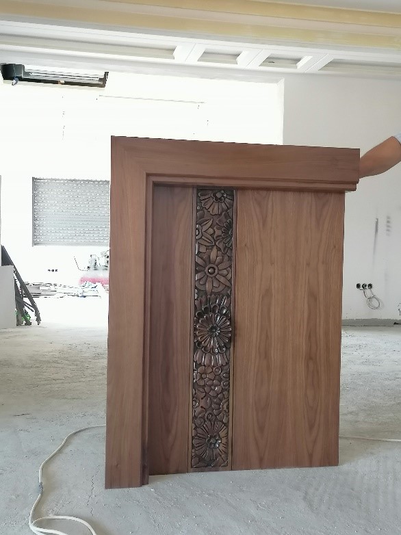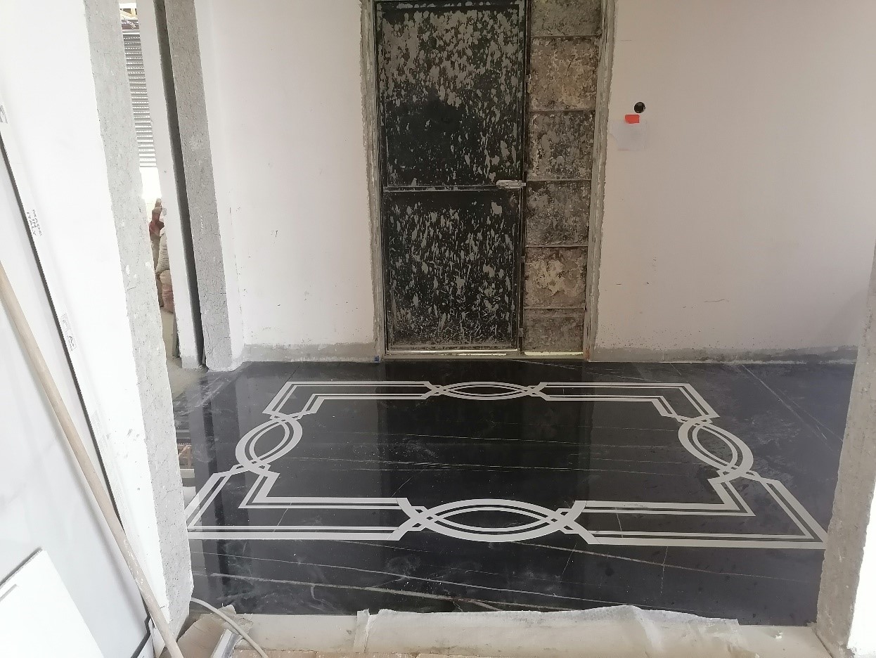 الصورة في الأسفل للأرضية قص waterjet و مطبقة على الواقع. بالإضافة لنموذج للأبواب.