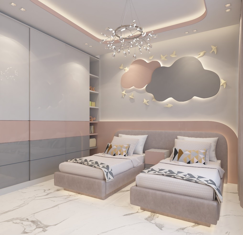 تصميم يناسب طلب العميل و وظيفة الفراغ حيث تم الحرص على تأمين فراغ الدراسة بالإضافة للسريرين و الخزانة.