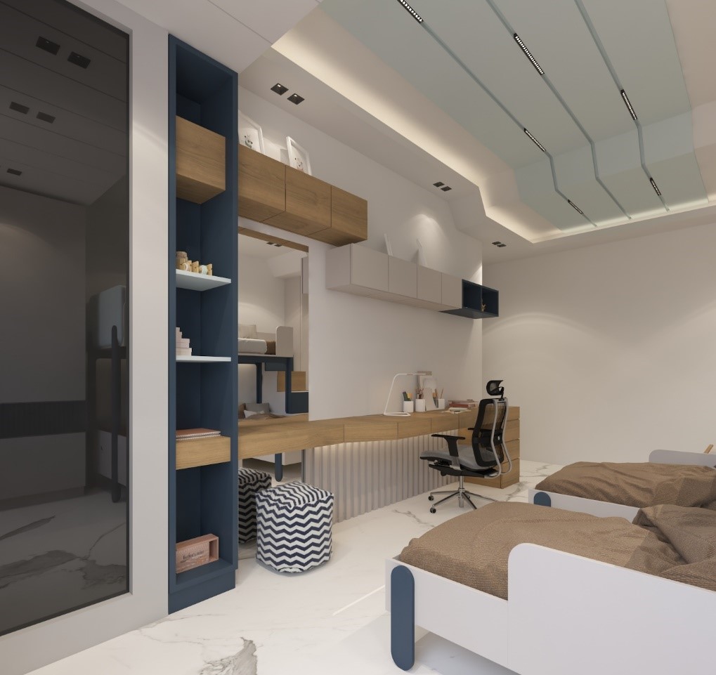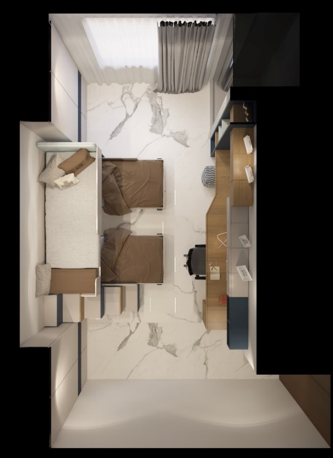تم التصميم مع اعتماد إمكانية إضافة سرير (طابق ثاني) للاستخدام في حال نزول ضيف.